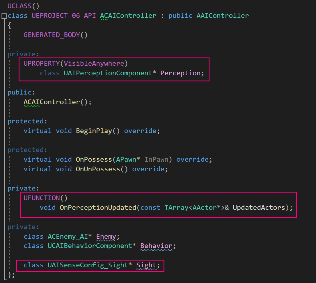 또한 감지의 종류 중 하나인 '시야 감지'를 구현하기 위해 UAISenceConfig_Sight 변수를 선언해주었다.