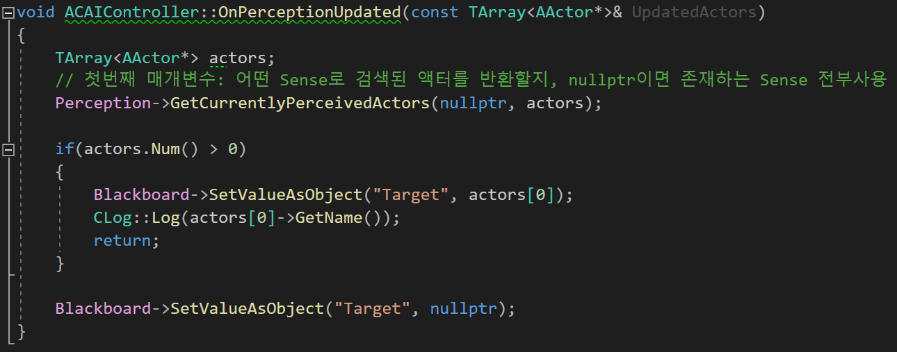 OnPerceptionUpdated 함수에서는 감지 범위 내에 들어온 Actor들을 배열에 저장하고,