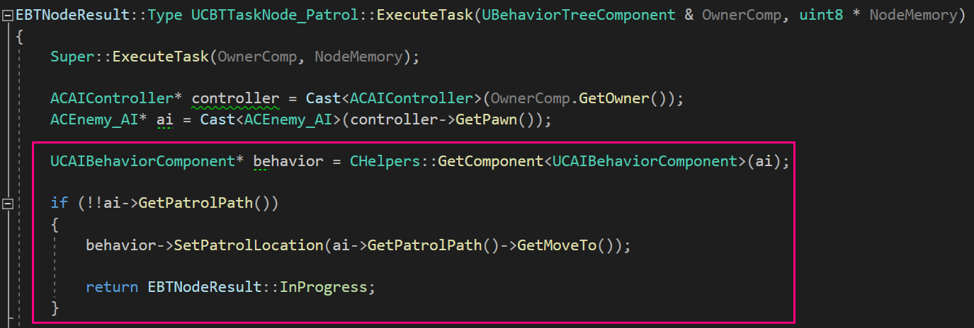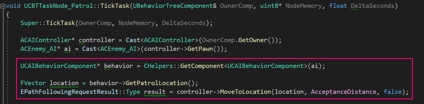 Patrol Task 클래스의 ExecuteTask 함수에서는 Enemy_AI가 가지고 있는 비헤이비어트리 컴포넌트를 불러와 PatrolPath가 존재한다면, 비헤이비어의 PatrolLocation Key 값을 Spline의 위치 값으로 초기화할 수 있도록 하였다.