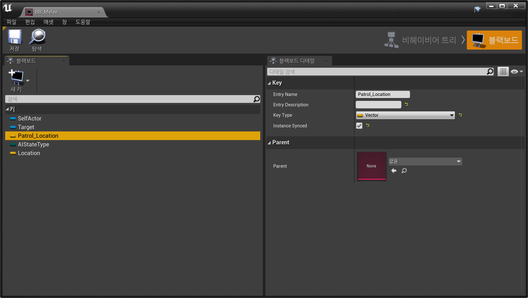 먼저, 블랙보드 키 값으로 Patrol Location을 추가하였다.
