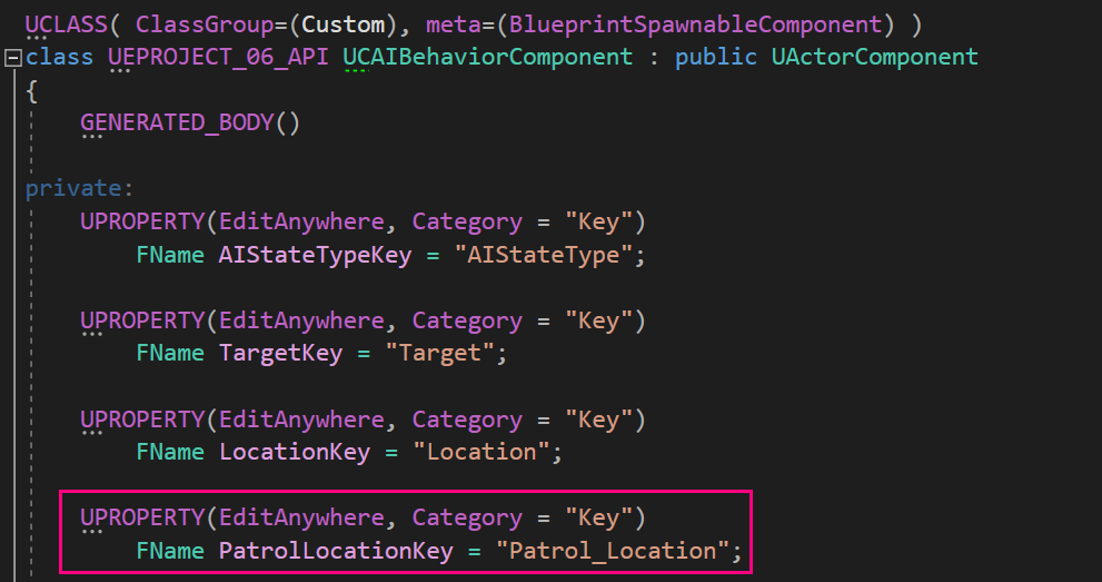 이런 블랙보드 키 값을 가져오기 위해 PatrolLocationKey 변수를 CAIBehaviorComponent에 추가하였다.