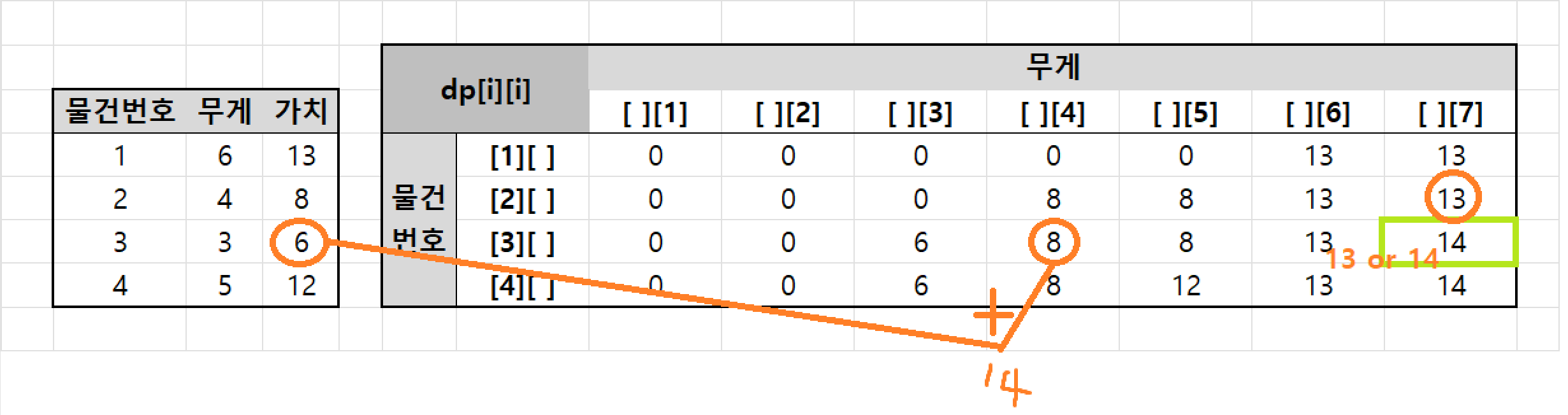 두 경우를 비교했을 때 3번 물건을 담는 경우가 더 큰 가중치 14를 가지므로, [물건3][무게7]의 가중치는 14가 된다.