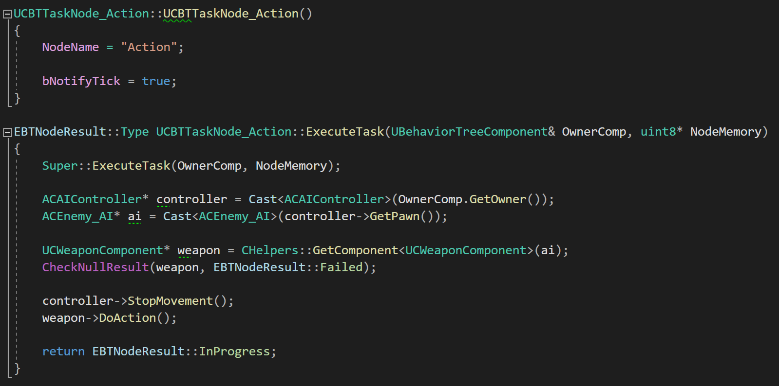 TickTask 함수에서는 Enemy가 공격을 끝내고 다시 Idle Mode가 되었는지, 현재 공격이 실행중인지를 나타내는 bInAction변수가 false인지를 검사하는 bool 형을 선언하였다.