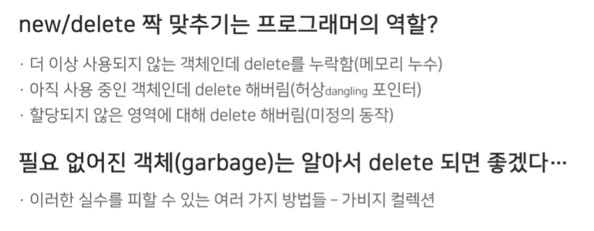 이러한 실수를 피할 수 있도록 필요 없어진 객체(가비지)는 알아서 삭제해주는 가비지 컬렉션이 필요하다.