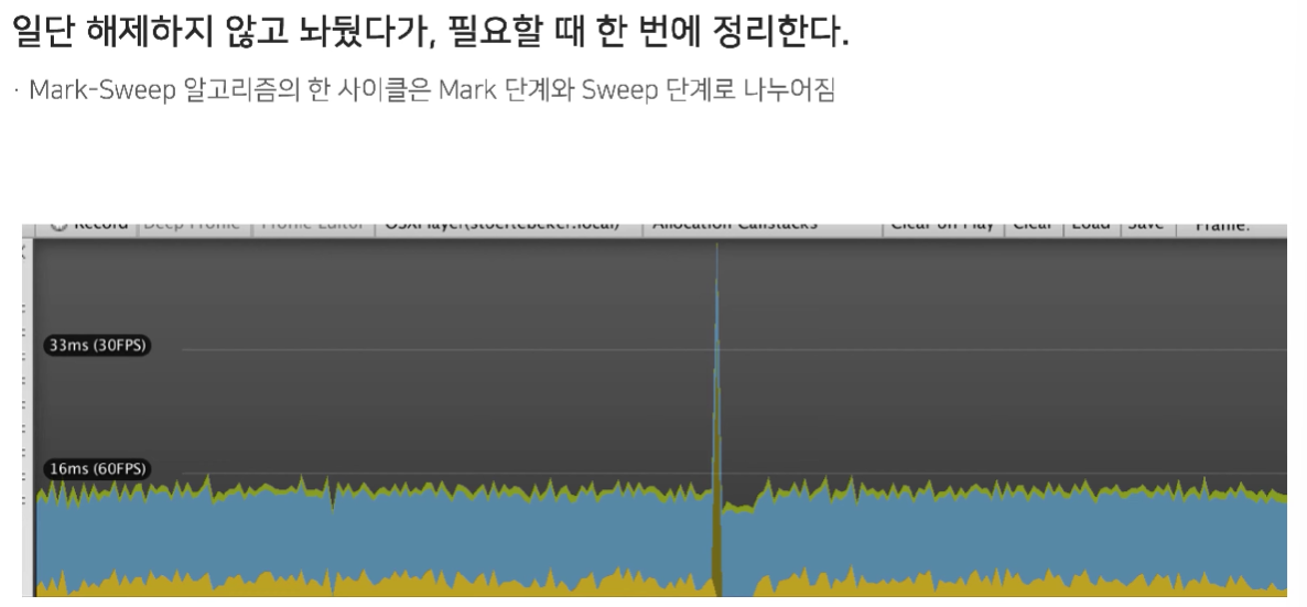 Mark 단계에서는 어떤 객체가 필요없어지더라도 당장 신경쓰지 않고 냅뒀다가, 메모리가 부족해지거나 정리할 필요가 있을 때 Sweep 단계에서 한번에 정리하는 방식으로 이루어진다.
