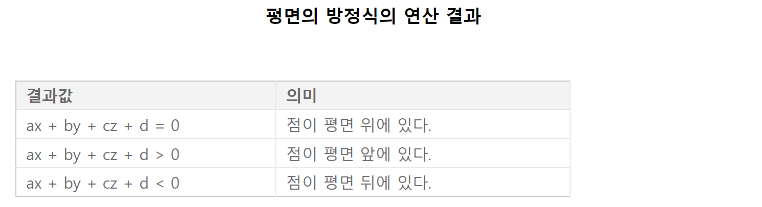구해진 벡터가 바로 평면 방정식의 법선 벡터가 되어, 원점의 거리를 나타내는 d 값을 통해 방정식에 값을 대입할 수 있습니다.