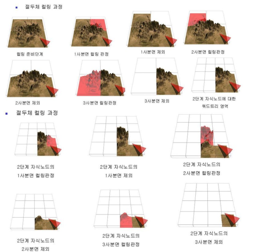 주로 지형에 많이 사용되는 컬링 방식으로, 지형을 4등분하는 형태로 나누고, 나뉜 지형을 또다시 4등분 하는 것을 반복하는 형태로 노드를 만들어둡니다. 이후, 개별 단계에서 사분면 자체가 절두체에 포함되지 않으면 해당 사분면 전체를 제외해버리는 방식입니다.