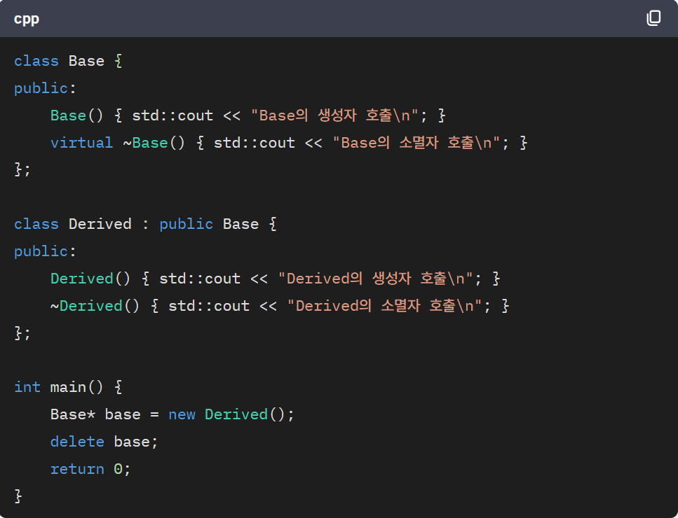 virtual 키워드를 사용하면 C++ 런타임은 객체의 실제 타입을 확인하고 적절한 소멸자를 호출합니다. 즉, 파생 클래스의 객체에 대해서는 파생 클래스의 소멸자가 먼저 호출되고, 그 다음으로 기본 클래스의 소멸자가 호출됩니다.