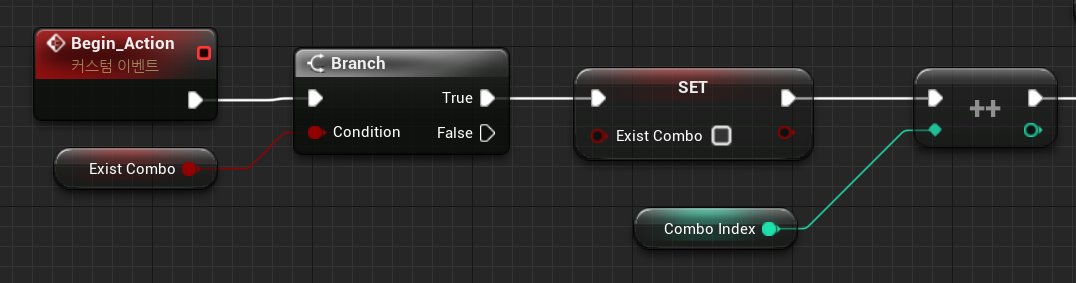 6. 이때 아까 활성화시켰던 콤보가 존재한다는 Exist Combo 변수가 True라면 중복을 없애기 위해 False로 초기화한 뒤 Combo Index값을 1++하여 다음 콤보 공격 애니메이션이 Anim 몽타주에 플레이되도록 한다.