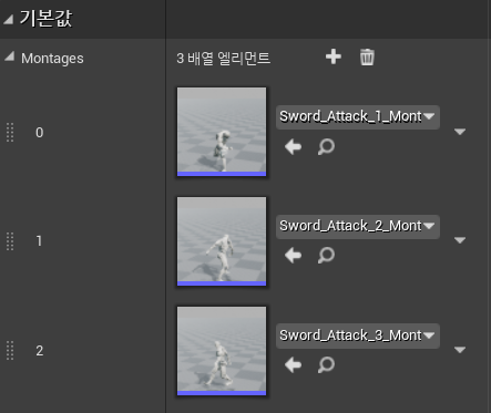 Montages 배열에는 콤보공격에 사용되는 3가지 몽타주가 들어있고, Combo Index 변수를 사용하여 공격 별 몽타주를 실행시킨다.