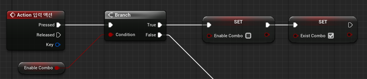 5. Enable Combo변수가 True로 변해있을 때 플레이어가 마우스 좌클릭으로 액션 입력을 주면 플레이어 블루프린트에서 조건문 True로 넘어가게되고, 콤보가 존재한다는 Exist Combo 변수를 활성화(True)시킨다.