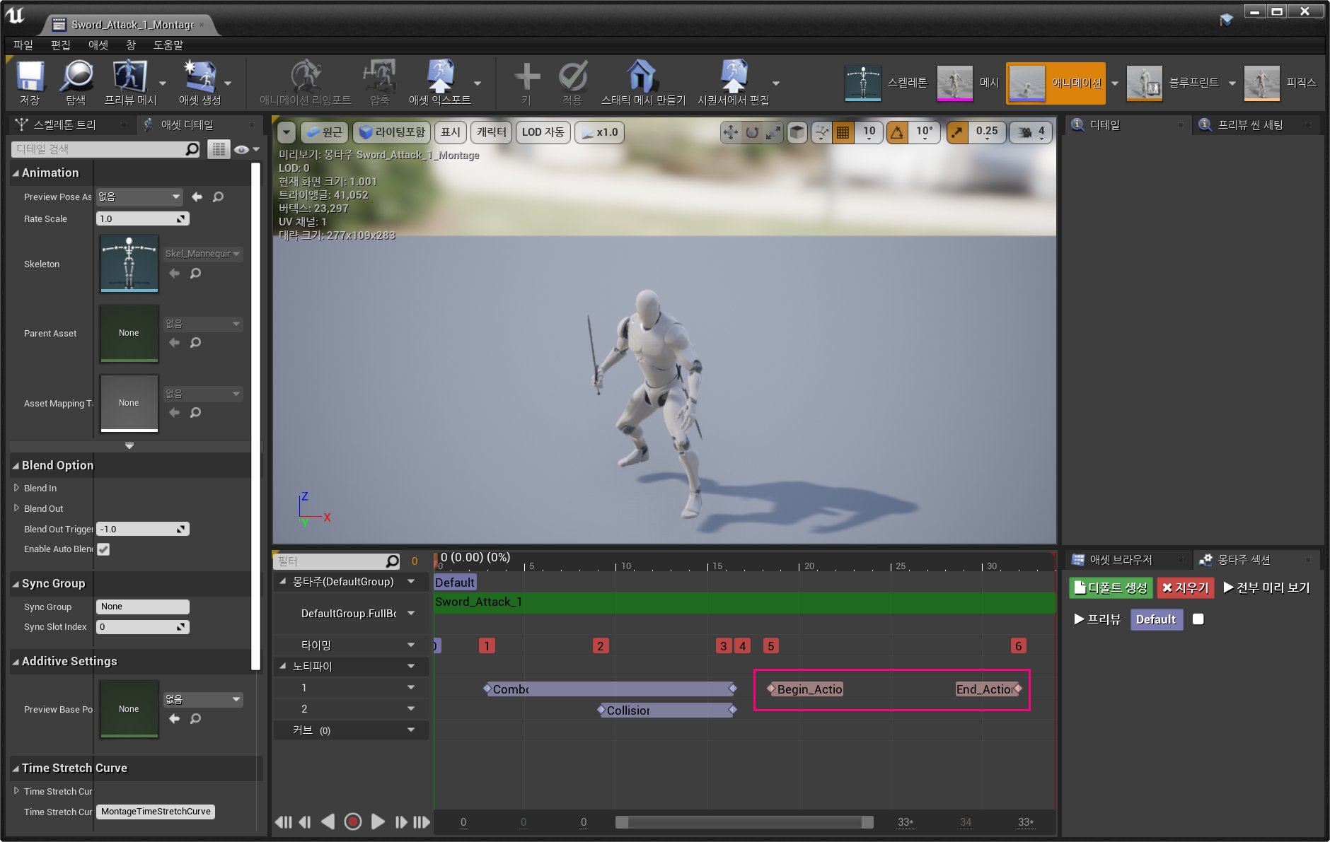 7. 위와 같은 과정을 두번째 공격 애니메이션의 몽타주에도 적용시키고, 마지막 콤보공격인 세번째 애니메이션 몽타주에는 다음으로 넘어갈 공격이 없으니 애니메이션이 끝날 즈음 End Action 노티파이만 실행한다.
