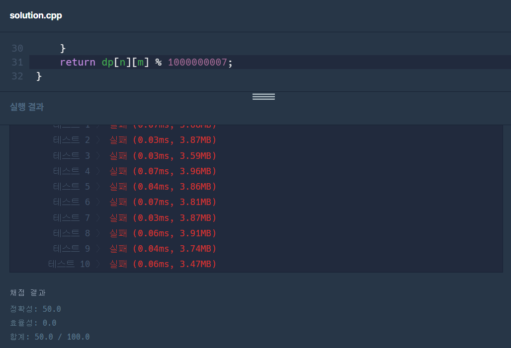 만약, 나머지 연산을 dp 초기값 설정에서 미리 수행하지 않고, 최종 return되는 곳에서 수행한다면, 테스트케이스 정확성 검사는 만점이지만, 효율성 검사는 빵점이 나온다.