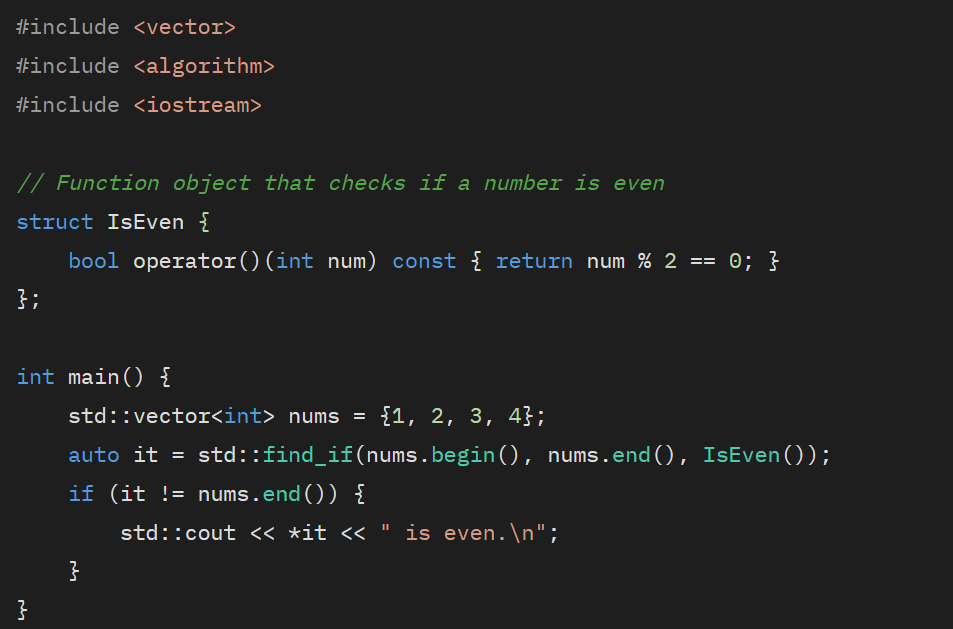 위 예제에서 std::find_if는 STL 알고리즘, nums.begin(), nums.end()는 반복자, IsEven은 함수 객체로 사용되고 있습니다.