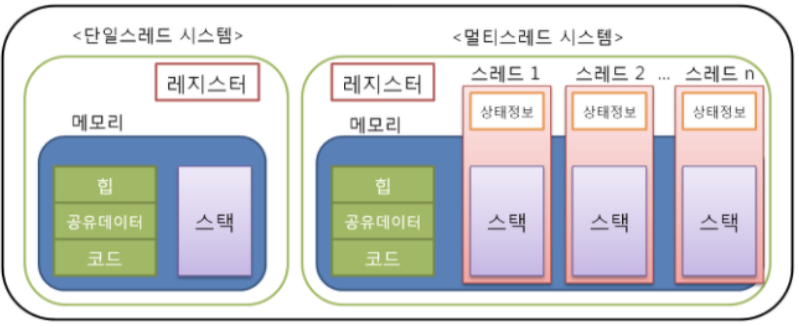 멀티 스레드는 하나의 프로세스에 여러 스레드로 자원을 공유하며 작업을 나누어 수행하는 것을 말합니다. 프로세스의 메모리 영역 중, 힙 영역과 코드 영역, 데이터 영역은 공유하여 사용하고, 스택영역은 개별적으로 사용합니다.