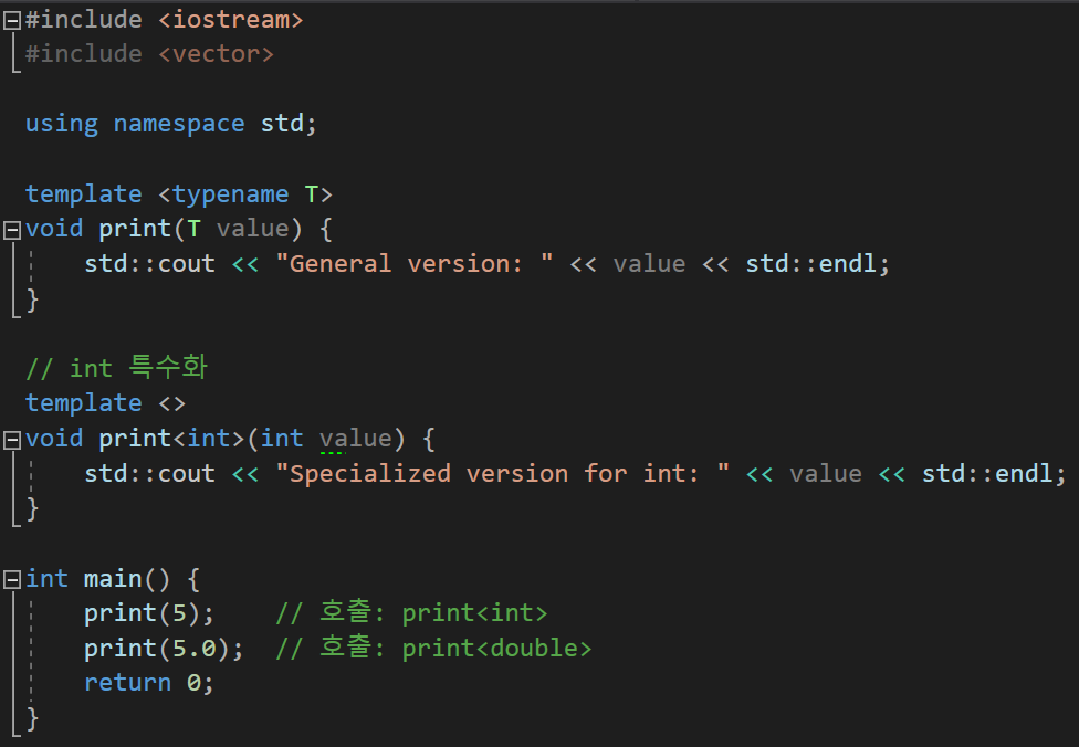 위 코드에서 print(5)는 <int> 자료형으로 특수화 시켜놓은 print 함수가 호출되고, print(5.0)은 일반 템플릿 함수를 사용합니다.