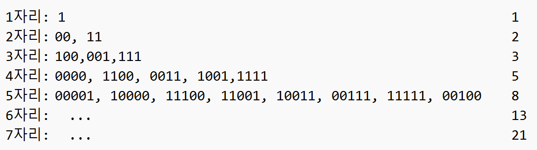 '00' 과 '1' 의 조합으로, N 자릿수만큼 만들 수 있는 가짓수를 전부 세는 문제였는데, 나는 처음에 단순무식하게 접근해서 직접 모든 경우의 수를 구했다.