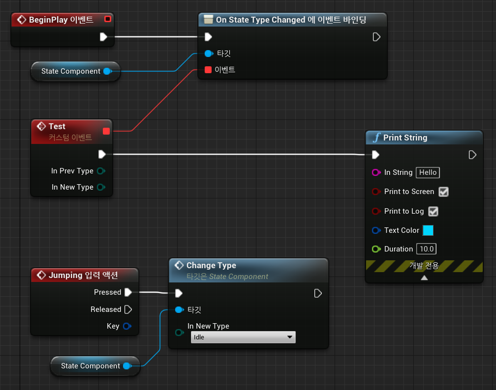 플레이어 BP에서 BeginPlay 함수가 시작되면 State 컴포넌트에 만들어둔 이벤트 디스패처에 Test 커스텀 이벤트를 바인딩하여 추가한다.