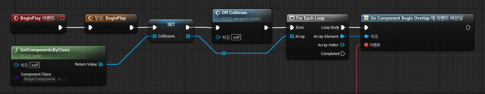 Get Components By Class 함수를 통해 Shape Component로 반환되는 모든 충돌체를 Collisions 배열(유형: Shape Component)에 저장한 뒤, 첫 초기화 단계이기 때문에 충돌체를 모두 Off 처리 해주었다. 이후에 존재하는 모든 충돌체의 충돌 처리를 위한 On Component Begin Overlap 이벤트에 바인딩하였다.
