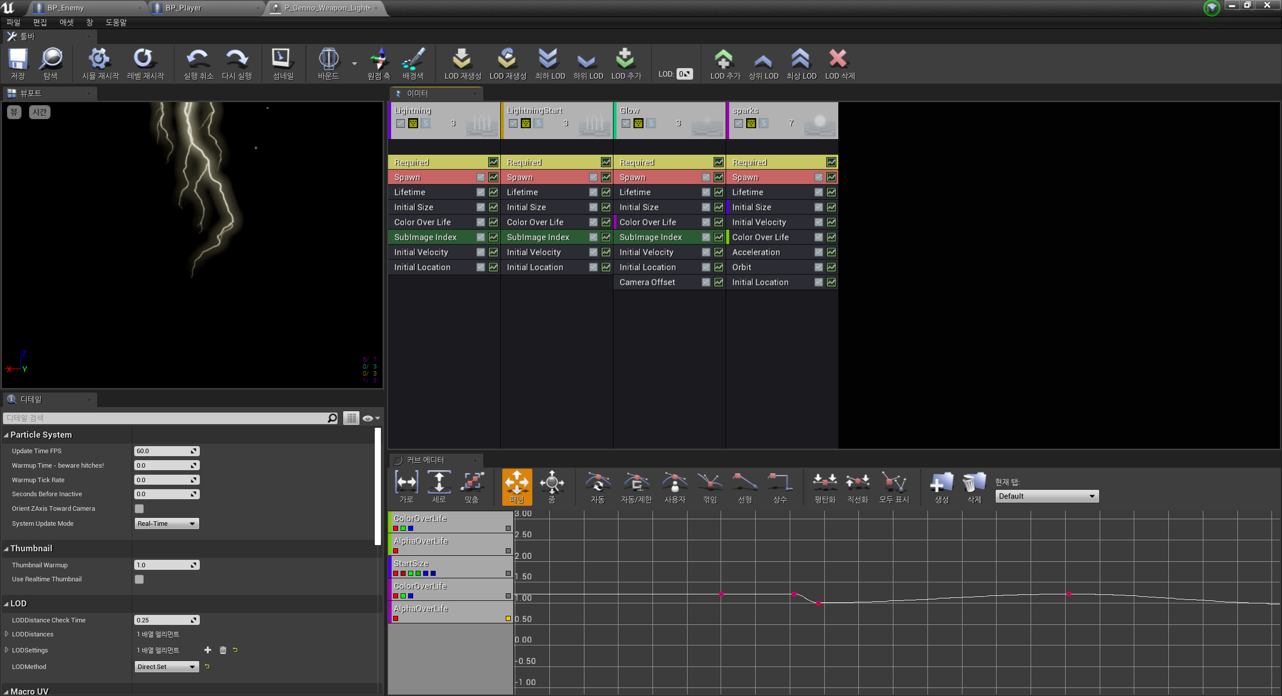 언리얼에 저장한 파티클을 실행하면 나오는 파티클 시스템 화면이다. 이런 화면이 열리는 곳을 캐스케이드라고 한다. 이미터(Emitter) 창에 나오는 열(이미터)들이 하나하나의 효과이다. 이펙트는 이펙트 개발자도 따로 있으니 프로그래머가 자주 사용하는 몇개의 속성만 알아보도록 하자.