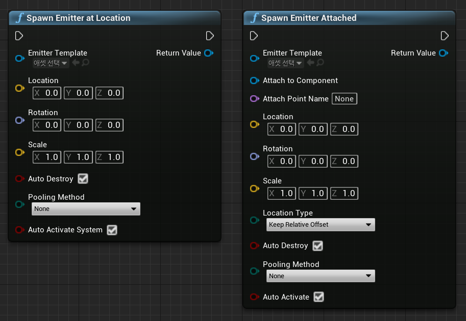 이렇게 설정된 파티클을 사용하고자 할 때는 Spawn Emitter 함수를 사용하면 된다.
