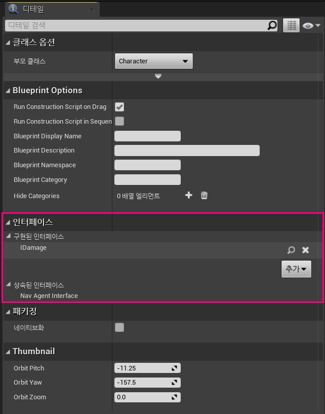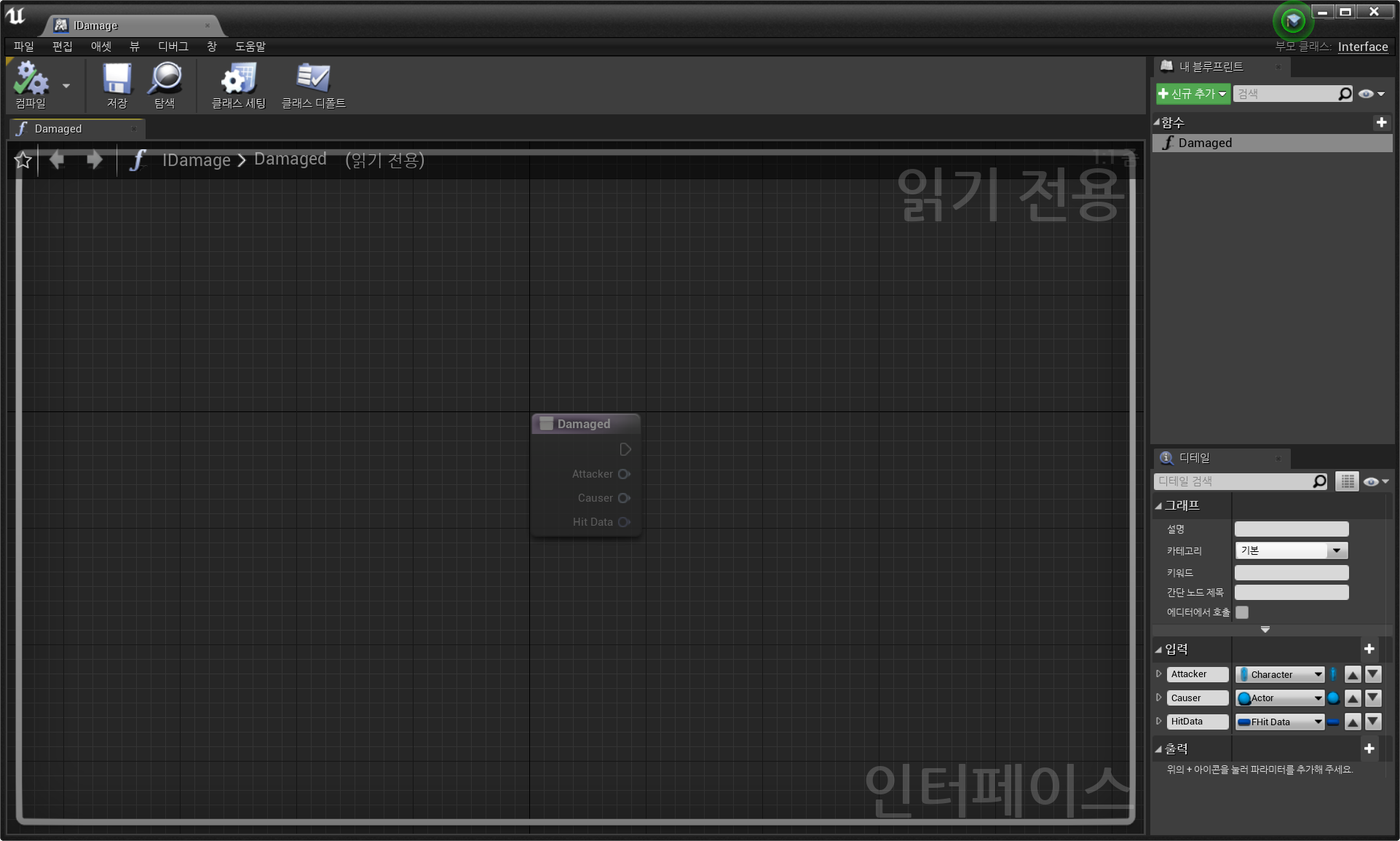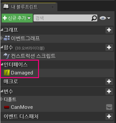 인터페이스에 아까 생성했던 인터페이스 IDamage를 추가하고 나면 왼쪽에 그래프, 함수, 인터페이스, 매크로, 변수 목록에서 인터페이스에 선언해두었던 순수가상함수 Damaged가 자동으로 추가되는것을 볼 수 있다.