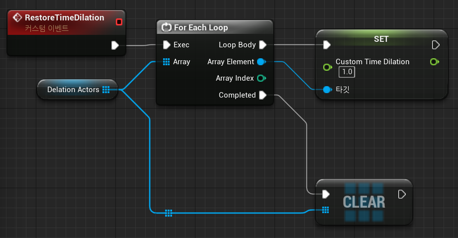 - RestoreTimeDilation 함수는 경직 시간을 설정했던 모든 액터들의 지연시간을 다시 정상화(1.0으로 설정)하는 함수이다. for문을 돌리면서 모든 액터를 초기화한 뒤, 배열을 Clear 함수로 비워주었다.