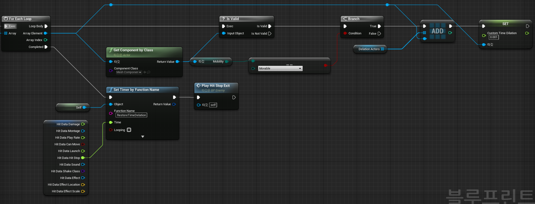 - Mesh Component가 존재하고, 모빌리티가 Movable이 맞다면 해당 액터를 경직 동작을 수행할 Delation Actors 변수에 추가해준 뒤, Set Custom Time Dilation 함수를 통해 1000분의 1초로 액터들의 시간을 지연시킨다.