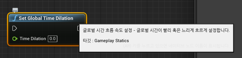 Set Global Time Dilation은 게임 전체의 시간을 늦추는 함수이다. 이는 예제로만 사용해보고 실제 게임 구현에는 사용하지 않는다.