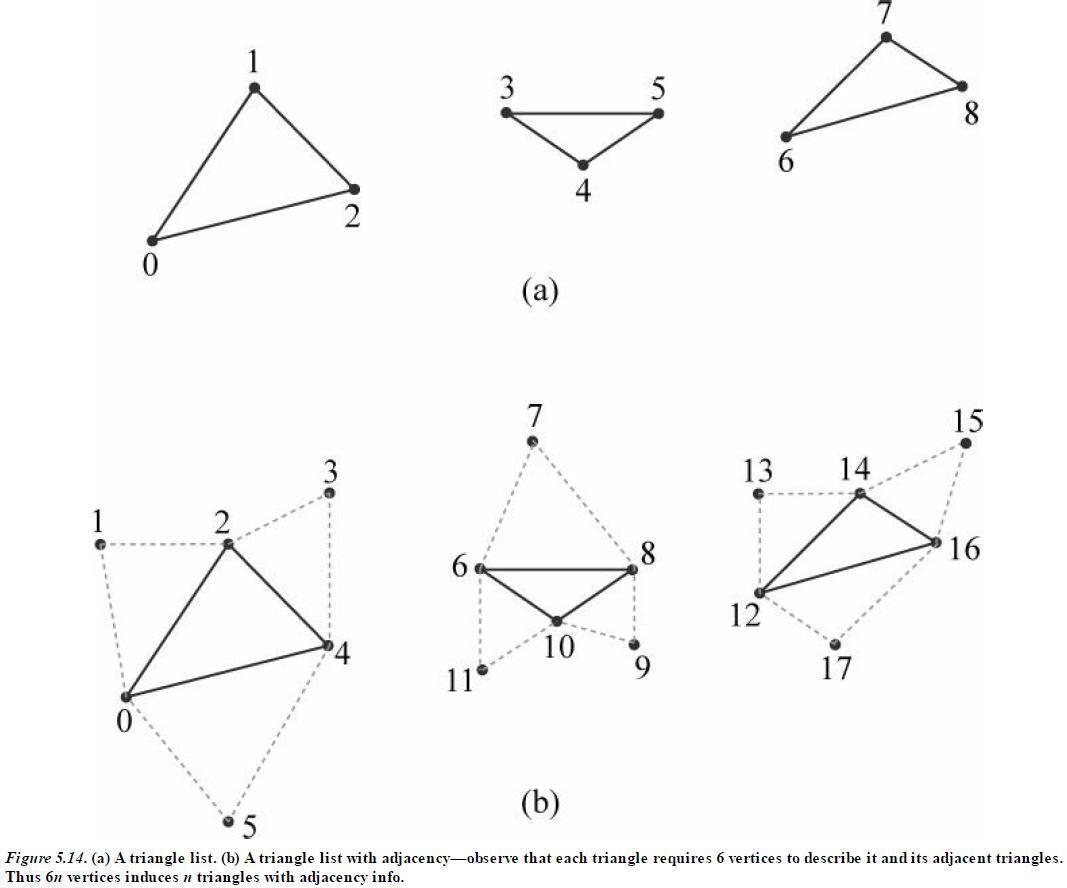 삼각형 목록을 만들 때, 각 삼각형에 인접한 이웃 삼각형 세 개에 관한 정보를 포함하여, 인접성(Adjacency)를 가진 삼각형 목록이라 칭한다.