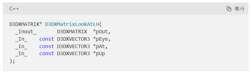 https://learn.microsoft.com/ko-kr/windows/win32/direct3d9/d3dxmatrixlookatlh