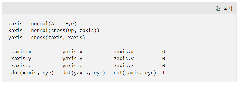 해당 함수의 반환값으로 Matrix (World)행렬이 나오는데, 해당 행렬 구성에 사용되는 수식을 자세히 살펴보자