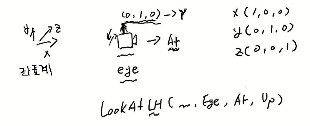 D3DXMatrixLookAtLH 함수는 왼손 좌표계의 매트릭스를 작성하여 카메라를 다룰 수있도록 도와주는 함수이다.