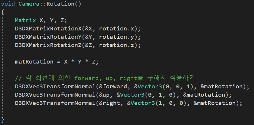 회전공간 세개 X,Y,Z를 곱해서 회전공간을 만들었으니, 카메라가 회전하여 직선방향에서 대각선 방향을 바라보도록 변화했다면 카메라가 봐야하는 Matrix공간도 대각선 방향으로 회전해야 하므로 이때 위 함수들을 사용하면 된다.