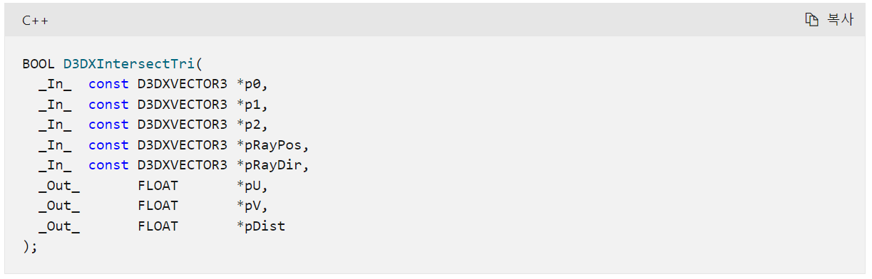 - 반환값 : 광선(Raycast)이 삼각형 영역과 교차하는 경우 TRUE를 반환, 그렇지 않으면 FALSE를 반환